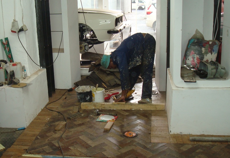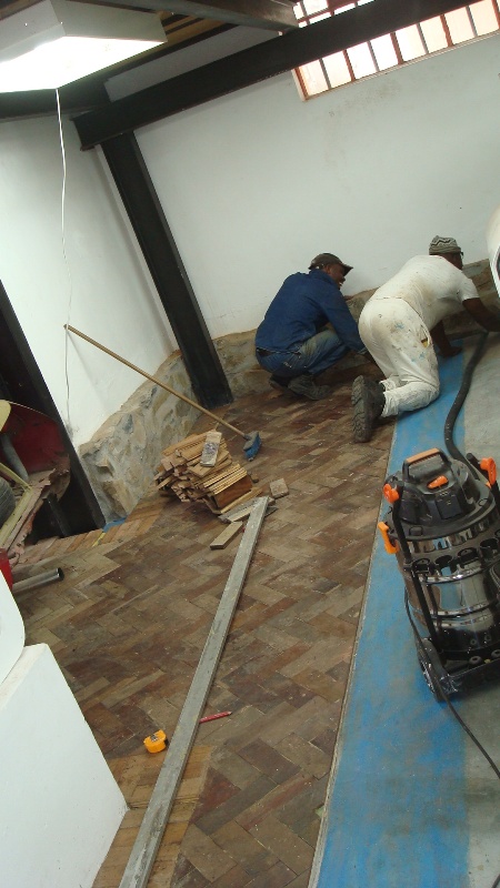 Many moons back we acquired some dozen's of bags with old parquet flooring. Now that the building operations are coming to an end, those bags were still standing around. Originally we had planned to find sponsors to tile the museums floor, but that never saw the light of day. So why not using the wooden floor that is already there ? Furthermore, wood is warm and soft, and you can safety drop a hammer. So we put it all down now, and I am very happy about it.